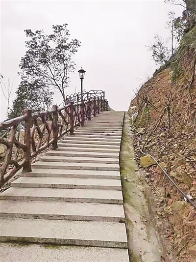 这条登山道宽1.8米,长1480米,于2021年3月开工,当年7月完工。沿途有长廊、凉亭,有路灯、栏杆,还种起了杨梅树等果树,增添了美感,风光无限。