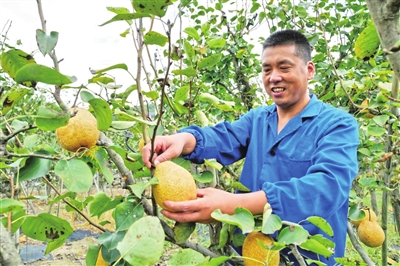 同样洋溢着丰收喜悦的还有大荆镇大园村果农林广云。记者在其果园看到,略比人高的梨树上结满了累累果实,沉甸甸的蒲瓜梨压弯了树梢,每个生长在树上的梨子都用果袋套装着。林广云正在采摘最后一批蒲瓜梨。与别处不同的是,他家的梨树上还仿野生种植着铁皮石斛。