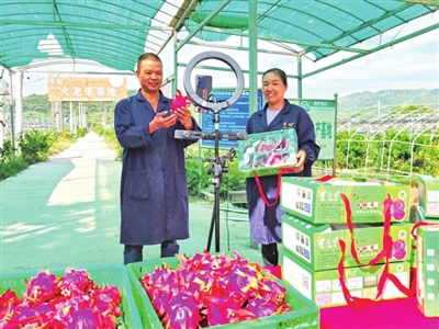 “火龙果一般在7月上旬开始采摘,15天为一个批次,可以持续采摘到12月份。秋分时节成熟的火龙果口感最好,但建议大家不要买太多,我们的火龙果原生态种植,只能存放5天左右。”在“号付生态圈”微信直播平台,号付和妻子熟练地向市民朋友介绍火龙果的特点。在云端,数百名老客户正在观看这场田间地头的特色直播。