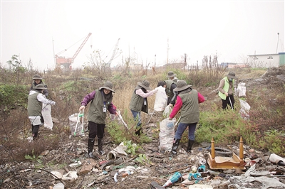 近日,乐清市环保公益协会开展保护滩涂行动,20多名志愿者来到七里港滩涂,冒着绵绵细雨清理滩涂垃圾。应裕智 摄