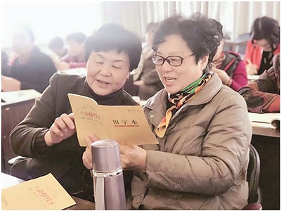 识字课采用人教版语文课本,老人们和小学生一样,接受正规且系统的教学。虽然很多老人不会写字,但他们非常投入,一丝不苟。朱晓芳精心准备课件,通过图文搭配、普通话和柳市方言相结合的方式,让学员们充分感受到学习的乐趣。“在上课的过程中,我时常走到学员的身旁,通过观察他们的握笔姿势和书写流畅度,可以判断出他们的文化程度,然后适当调节上课的速度与节奏。”朱晓芳说,“很多老人从来没有上过学,他们对这样的课堂时光十分珍惜,也从不吝啬赞美之词,对老师非常热情和尊敬。两个小时的上课时间很愉快。”老师们也会认真批改作业,写得好的字会画一个圈,学员们之间暗暗较量,比比谁画的圈圈最多。优秀的写字作业会在走廊上的宣传栏展示,这对老人而言,是一种荣耀,也是一种激励。