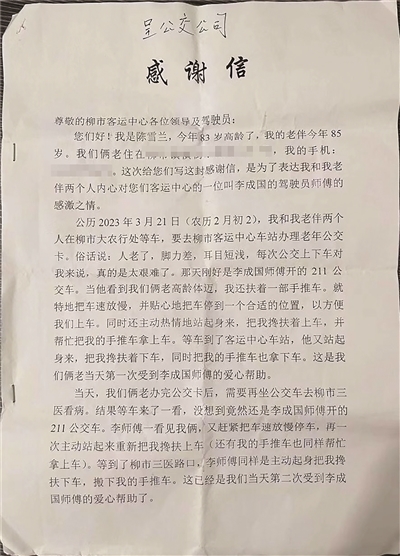 为此,前不久,陈奶奶和叶爷爷考虑再三,决定给李师傅写一封感谢信,在感谢他的同时,也要感谢乐清市公交公司对驾驶员的培养和教导。在信中,陈奶奶还特别提及:“我过去独自乘车时也时常遇到李师傅,每次遇到有老人乘车,李师傅都是这般的爱心满满、热情主动,如此的社会正能量,怎能不让我心存感激、感慨万分。”