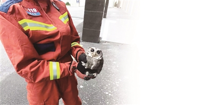 当天18时13分,消防救援人员到达现场,准备捕捉这只猫头鹰,谁知猫头鹰突然飞向窗户,一头撞上玻璃,掉在地上。
