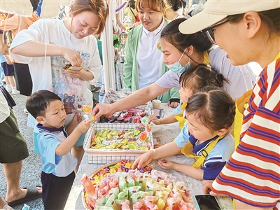 昨日,城南街道宋竹社区邀请了十余组亲子家庭组合作为“美食志愿者”,为辖区儿童免费提供三千余份亲子美食。同时,社区联合宋湖里坊文化创意街区,辖区各幼儿机构、美食商铺纷纷助力,在幸福广场上,为孩子们打造了一个集游乐美食于一体的欢乐天地,让小朋友们充分体验节日的乐趣,享受舌尖上的“六一”。