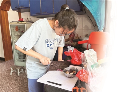 当天临近中午时,津津起身略不好意思地说:“我要开始做饭了。”只见她小心翼翼地开始切洗,这个暑假,她挑起了为一家煮饭烧菜的重任。