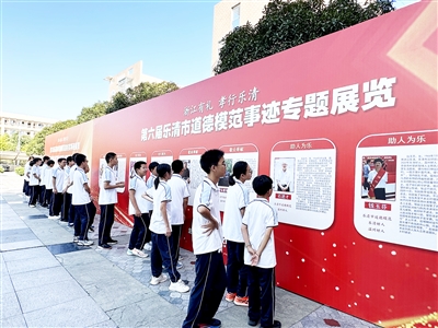 本报讯(乐清市融媒体中心记者 张晓静)“快看,学校里的展览好特别!”10月29日,第六届乐清市道德模范事迹专题展览走进乐清市外国语学校,吸引了许多学生和教师驻足观看。本次展览以“浙江有礼 孝行乐清”为主题,展出了17位事迹感人的道德模范。他们中有的面对村民们一次次的接济,默默许诺滴水之恩当涌泉相报,当多年后经济条件改善后,她兑现了诺言,坚守在村中做好事,报答村民们的恩情;有的听到有人落水的呼救声,毫不犹豫地跳入冰冷刺骨的河水中,全凭“救人”信念将落水群众救上岸;还有的十年如一日悉心照顾病榻上的公公,孝敬婆婆一如自己的亲娘,以实际行动诠释孝老爱亲的品质……