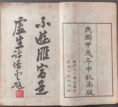 先生器宇弘远,留心文献。其于民国庚申(1920)应聘为芙蓉林家西席,暇辄出游雁荡,懼诸题咏磨灭,乃不惮穷幽访录,且辑散见于各书,裒为一辑,颜曰《雁山鸿爪》。后闻当道拟将雁山列为省风景区之冠,将开五省交通周览会,为使名山生色,特将是集出版,时民国甲戌年(1934)中秋,由乐清天一书局发行,乐清印刷所印行。此书由永嘉区专员许蟠云署签,并于扉页录江弢叔“不游雁宕是虚生”题句。