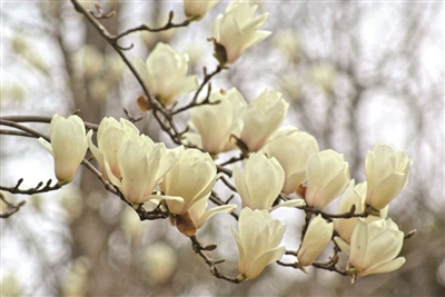 现在正在盛开的木兰花有两种常见的颜色,一种是白色的,人们通常叫做白玉兰,还有一种微带紫色的,人们叫做紫玉兰。