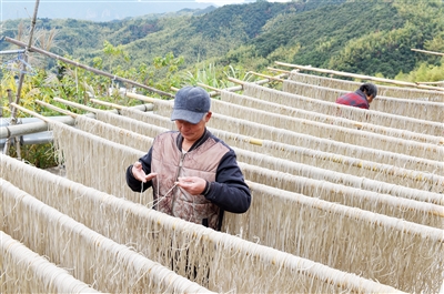 近日,趁着天气晴好,村民将刚制作出来的漏斗面晒在智仁乡智胜村山坡上。随着年关临近,村民备足年货,方便市民采购。 近年来,智仁乡利用山水生态优势,大力发展特色农业,打响“智仁五宝”品牌效应,不断提高“竹乡智仁”的知名度,实现百姓增收。乐清市融媒体中心记者 郑剑佩 摄