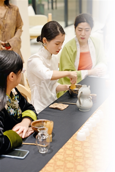“我担心在台上容易出错,所以专门复习英语,还把点茶的文言文资料翻译为白话文后,再译为英文,希望能帮助国际友人更加了解点茶文化,自己也能更从容应对现场观众的提问。”陈园瑶说,谈到咖啡拉花,很多人都熟悉。但鲜有人知的是,千年前的中国宋代,点茶中的“茶百戏”“水丹青”就已将在饮品上作画这件事做到了极致。“注汤幻茶成诗成画。”仅用茶、水二物便能在茶汤中显示文字和图像,这一技艺一亮相,在场的外国友人忍不住称奇。