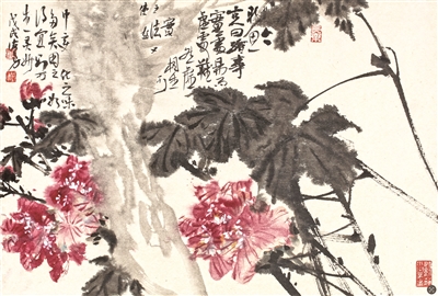 “雁山花树”板块以乔木、花卉为主要描绘内容,展开对自然之气生机于变化的无限挥写。当年,潘天寿先生数次访雁荡,寻幽探秘,最后以巨石流涧、浪漫山花来写意雁荡,创作“雁荡山花”等不世名作。此番,刘海勇寻访前人足迹,数次攀登雁荡山,山间的杜鹃、芙蓉、桂花、鸡冠花、菖蒲等,这些随处可见的花卉皆是他笔下创作的题材。他觉得,生命的本质其实非常淳朴,春来秋去,花开花落,不断轮回,但天地有情,生灵有心,花草树木是天与人的中间态,其中有沉甸甸的历史观和生命体验。
