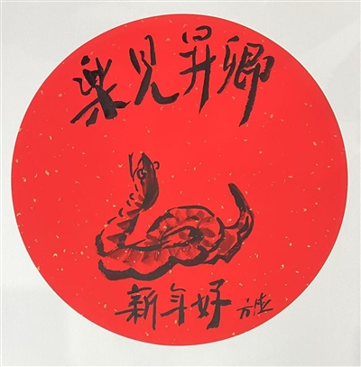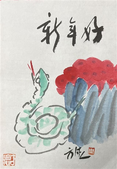 甲申岁杪,方德老师发来几幅乙巳年贺岁佳作,有两幅画了乙巳年的年肖——灵蛇,上款题“嘉福昇卿”“樂見昇卿”。