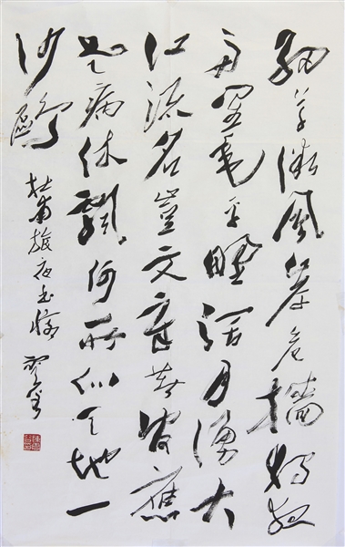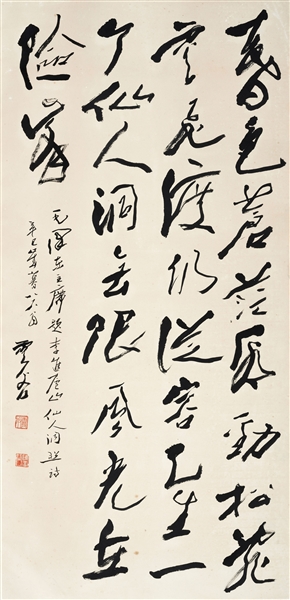 再者,其书以汉魏为风骨,气格之美,以雄强为主,峻厚奇崛、豪放苍茫,隽秀飘逸兼之。分明有山岳奇骏、云水悠悠之韵。直追六朝书法质朴真醇、恣肆烂漫之趣。他向往蔡邕“书者,散也。欲书先散怀抱,然后任情恣性”之境,胸襟邈远,故其各体书皆开张宽博,饶有气度。又不失之于狂野,清逸怡人,有书卷气,正如其人,旷达而温和。“逸”作为一种超脱格调,在当代书坛几乎已流失,不想被先生体悟得深远。曾论书云:“妙迹务必涵仙气,结习沾身脱去难。欲使尘烟离笔下,汉魏碑碣可过关。”范景中先生曰:“今观先生晚年合作,势若飞动,大有《瘗鹤铭》遗法,冥契暗合……云谷先生则不求与古人合而翕然自合,山水清音,犹不致珠沉璧委已。”(《陈云谷书法集序》)
