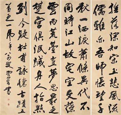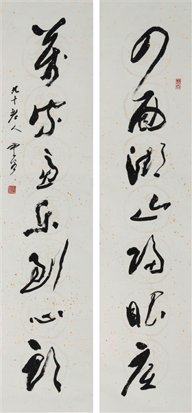 先生书艺另一可贵之处,在于功力深厚,苍老善变。书法讲究人书俱老,真要苍老醇香起来,只有老龄书家更有机会求之。其大部分精品,皆在八十岁以后所书。挥运之迹,无不骨强气健,常有篆隶体势,多见碑意,有金石魂魄。其书境,如清人高凤翰所言:“不抱云山骨,那得金石心。自然奇节士,落墨见高襟。”文怀沙先生跋曰:“横而不流,梗其有理,吾于云谷先生书艺中见之,曷胜钦羡!”至于善变,是坚持临帖、精研各体、融会贯通所至。古今书家,中年时期已有定型者多,少见衰年变法。旁观近人,唯香岛饶宗颐先生与云谷先生相似,耄耋之年,多风格,变化莫测,有如云山,富气骨,而无常态。