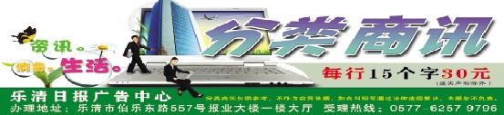 教育培训 ●学淘宝网上开店选春华教育 电子商务 网店客服、网店美工、网店推广 在家做生意 自己当老板 62725595 ●公办乐清电大,您的学历进修首选!热推政府 学费补助专业——学前教育。学校另设社区学院、 城市学院市民素质培训中心、浙大远程、东北师大 学习中心,咨询报名:62525033 QQ:146343508 综合信息 ●乐清市地税局偷税举报 电话62575000 ●黄杨木雕小红工作室15157771710 ●海宁皮革城购物一日游61510167 遗失声明 遗失乐清市亚通塑钢门窗有限公司财务章(3303820015414),声明作废。 遗失乐成镇田垟村王品权土地使用证,证号:缺,宗地号:039-009-0317-0000,日期:1994年11月10日,声明作废。 遗失乐清市慎海电镀厂国、地税税务登记证(副本),号码:330323101922828、税字:330382745815319,声明作废。 遗失象阳镇高四村郑小朋土地使用证,证号:1-2003-47-14,宗地号:047-022-0610-0000,日期:2003年4月22日,声明作废。 遗失南岳镇前塘村连秀泽土地使用证,证号:缺,宗地号:028-022-0146-0000,日期:1994年6月12日,声明作废。 遗失乐清市城东街道香格里拉嘉园A幢1605室滕波、赵晓瑜契证,证号:00675961,契证编号:3303232013006834,声明作废。 遗失梁贝贝身份证,号码:330382198706014388,有效期限:2005年11月4日-2015年11月4日,声明作废。 遗失乐成镇杨岙村张千远土地使用证,证号:缺,宗地号:039-001-0179-0000,日期:1995年10月29日,声明作废。 遗失乐清市蓝田商务发展有限公司国、地税税务登记证(正、副本),号码:330323101220367、330382723611825,声明作废。 遗失柳市镇潭头村郑元朝土地使用证,证号:2-1994-44-4043,宗地号:044-061-0250-0000,日期:1994年11月24日,声明作废。 遗失柳市镇潭头村产权人为郑元朝的房屋所有权证,产权证号:030f06585,印刷号:00033219,共有人:黄茶芬,共有证号:030003183,印刷号:00012897,声明作废。 遗失2012年5月25日核准的温州天耐电气有限公司营业执照(正本),注册号:330382000228994,声明作废。 遗失乐清市虹武汽车部件有限公司国、地税税务登记证(副本),号码:330382080594311、330323103935791,声明作废。 遗失温州天耐电气有限公司组织机构代码证(正本),号码:59721427-0,声明作废。 遗失温州天耐电气有限公司国、地税税务登记证(正本),号码:330382597214270、330323102930487,声明作废。 遗失丁海勇国、地税税务登记证(正本),号码:330323103381274、3303231979040244193A,声明作废。 遗失柳市镇新建巷9号陈建共土地使用证,证号:1-1996-44-2220,宗地号:044-014-0082-0000,日期:1996年7月9日,声明作废。 遗失徐卓雅的身份证,号码:330382199502100924,有效期:2012年7月2日-2022年7月2日,声明作废。 遗失乐清市佳汇电子电器有限公司财务章,声明作废。 |