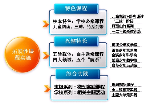 学校拓展性课程设置主要包括三个方面,一是学校特色课程;二是学生自主选修的兴趣特长课程,即“五院”课程;三是综合实践,主要包括班级微型实践课程、学校主题大单元实践和德育小主题实践活动等。
