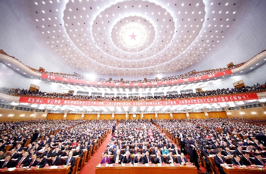 人民大会堂雄伟庄严,万人大礼堂气氛热烈。主席台上方悬挂着“中国共产党第十九次全国代表大会”的会标,后幕正中是镰刀和锤头组成的党徽,10面鲜艳的红旗分列两侧。二楼和三楼眺台上分别悬挂着“不忘初心,牢记使命,高举中国特色社会主义伟大旗帜,决胜全面建成小康社会,夺取新时代中国特色社会主义伟大胜利,为实现中华民族伟大复兴的中国梦不懈奋斗!”“伟大、光荣、正确的中国共产党万岁!”的横幅。