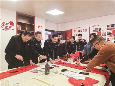 本报讯(乐清市融媒体中心记者 陈清清)日前,柳市镇文联、柳市镇新时代文明实践所联合黄华派出所开展书画家及工艺美术大师进警营活动,书法家、非遗艺术家现场送“福”送文化,并参观警营,同贺中国人民警察节。