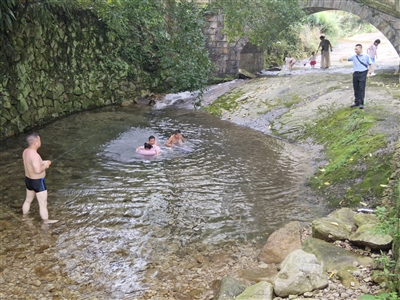 雁荡山大龙湫景区,工作人员劝阻游客不要下水游泳。 雁荡山管委会供图