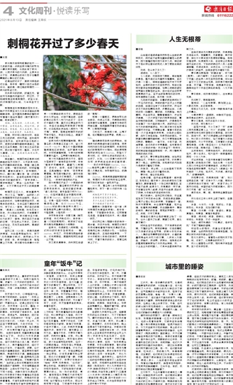 有个叫刘昌言的泉州才子,曾因为落榜写了一首诗来自我安慰,中有“唯有夜来蝴蝶梦,翩翩飞入刺桐花”的句子。后来,他做了商州记室,王禹偁赠他一首诗:“年来复有事堪嗟,载笔商州鬓欲华。酒好未陪红杏宴,诗狂多忆刺桐花。”以刺桐花之名,一段诗坛佳话就此产生。