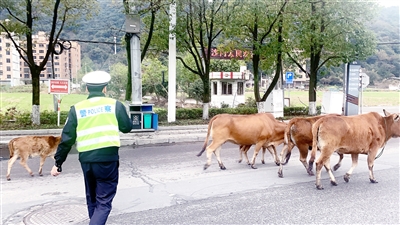 本报讯(乐清市融媒体中心记者 杨海虹 通讯员 余甘棠 徐建奔)日前,乐清交警安排警力加强雨天辖区道路巡逻管理,当交警经过104国道北白象镇沙门村路口附近时,突然发现路口处竟然有几头牛在乱窜,经过的车辆纷纷停车避让,而牛也被过往车辆吓得四处乱跑,甚至在车流中逆向奔走,存在极大的道路交通安全隐患。交警见状后立即停车,化身“赶牛倌”,将车流中走散的牛赶到一起。仔细一数,现场共计5头牛。