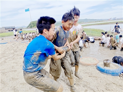 最让学生们玩得开心的要数“我爱‘泥’”下滩涂去体验抓螃蟹环节。学生们穿上厚袜子,挽起裤腿,在滩涂中,玩得像个小泥人。