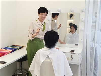 分享会上,几名女性兴致勃勃地上台体验色彩测试,英国CMB国际色彩形象顾问、林汐形象美学馆主理人林乐珍根据体验者的发色、肤色以及瞳孔色,将深浅不同、冷暖色调不同的几组专业测试布先后放置在体验者脖颈以下的部位,进行深浅、冷暖、净柔等细节观察对比。