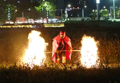 “这个木炭必须烧透,才会有大量火星。加炭后,整个火壶有三四十斤重,挺考验体力的。”卢保平笑道,无论是打铁花还是火壶,想要完成表演,不怕火、不怕疼是最基本的。被超过800℃的火焰围绕,表演者不仅要忍耐灼烧,还要有很好的控火能力。打铁花是朝空中打,而火壶表演与火的距离更近一些,表演过程中有时要旋转起来,整个人都是被火星包围起来。短短5分钟的表演,他要通过精准操控火焰的形态、颜色与速度等,抖得活灵活现。在他看来,这种技能学无止境,只有精益求精才能为观众呈现最美画卷。